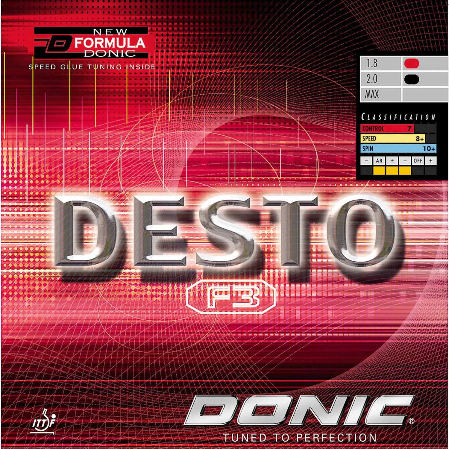 Der Desto F3 hat das besondere SpielgefĂŒhl. Er ist etwas schneller als ein herkömmlicher spinelastischer Belag.Seine Weichheit, sein nochmal verstĂ€rkter Frischklebesound und seine Dynamik bewirken aber ein deutlich harmonischeres SpielgefĂŒhl und damit eine bessere Ballkontrolle.Spielern, die bisher nicht frischgeklebt haben, empfehlen wir, mit dem 1.8 mm einzusteigen. Desto F3 ist wegen seines extrem guten BallgefĂŒhls besonders weich ausgelegt. Er darf nicht frischgeklebt werden. Beim Abziehen vom SchlĂ€ger könnte der empfindliche Schwamm beschĂ€digt werden. Donic ĂŒbernimmt keine GewĂ€hr beim Frischkleben.