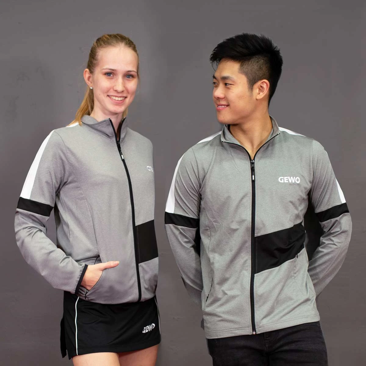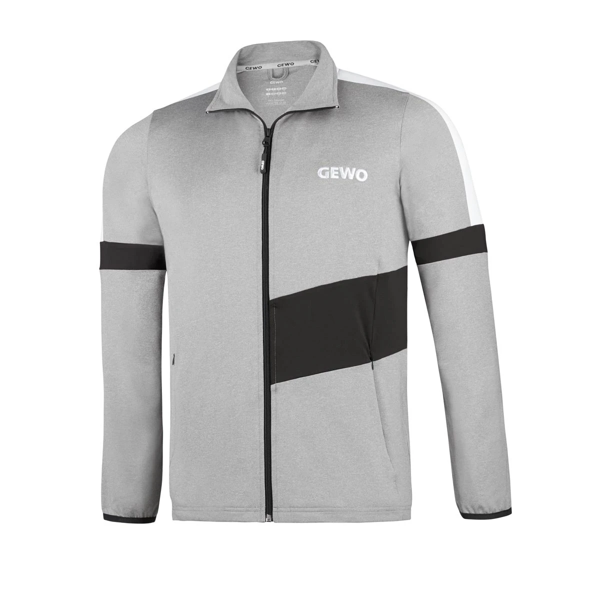Moderne Trainingsanzugsjacke von GEWO . Der höhere Kragen hält warm um den Hals. Zwei Taschen rechts und links mit Reißverschluss. Material: 100% Polyester.